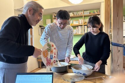 健一郎さんに米を炊いてもらい、ネットで調べながらシャリの準備をします。