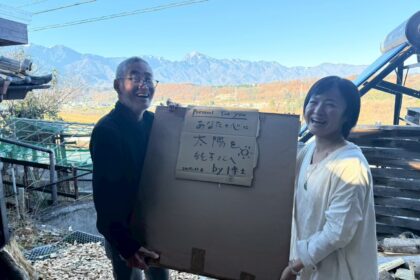 群馬の佐藤さんから伊那の佐藤さんへ太陽光パネルの授与。二人とも苗字は佐藤だけど血縁関係はありません。